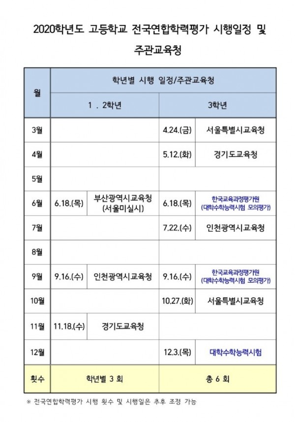 2020학년도 고등학교 전국연합평가 시행일정 및 주관교육청